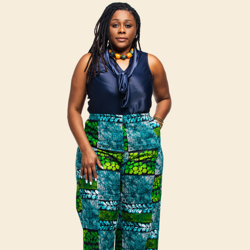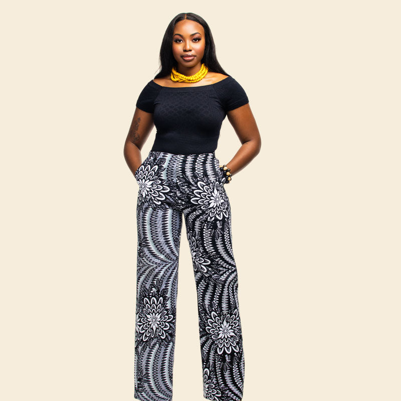 Step out in style with our High-Waisted Flared Leg Trousers, crafted from luxurious African Ankara fabric. Featuring a striking green, black, and white print, these trousers are designed to make a bold fashion statement while celebrating cultural elegance.