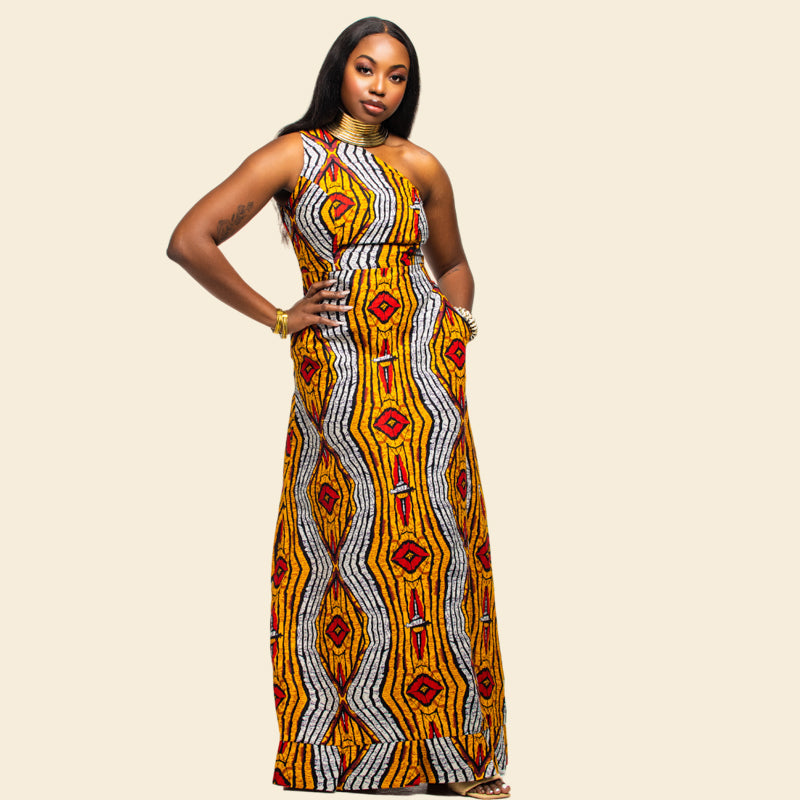 You look your best when you feel your best, and everything in this Maxi dress conspire to boost your confidence. You’ll be at the center of the action wearing this dress without upstaging anyone. Classy and and elegant, be ready to enter in and turn some heads. Made from premium cotton Ankara fabric, the charming asymmetrical neckline and the feminine flowing construction gives you the space to move freely without compromising on style.